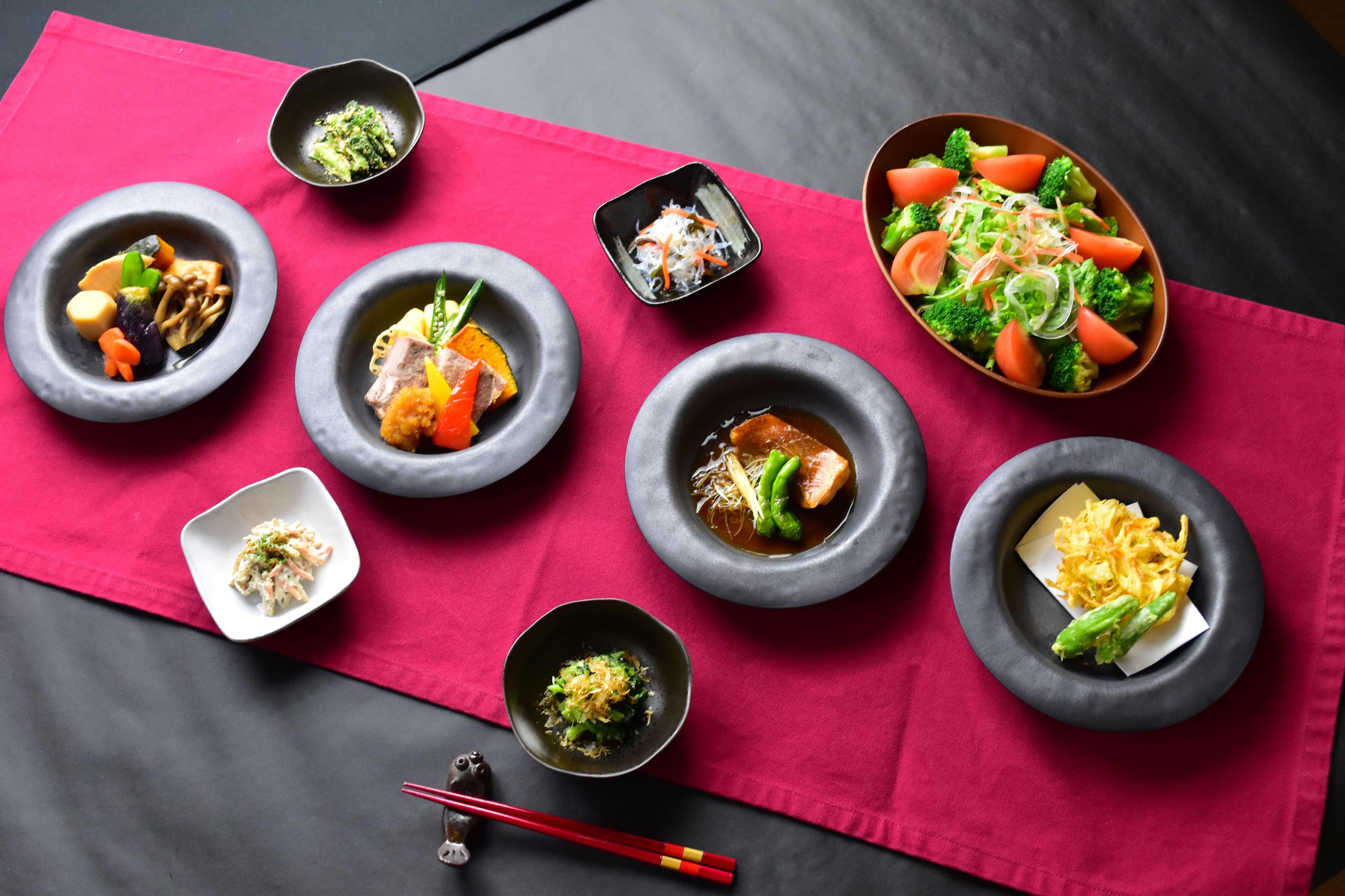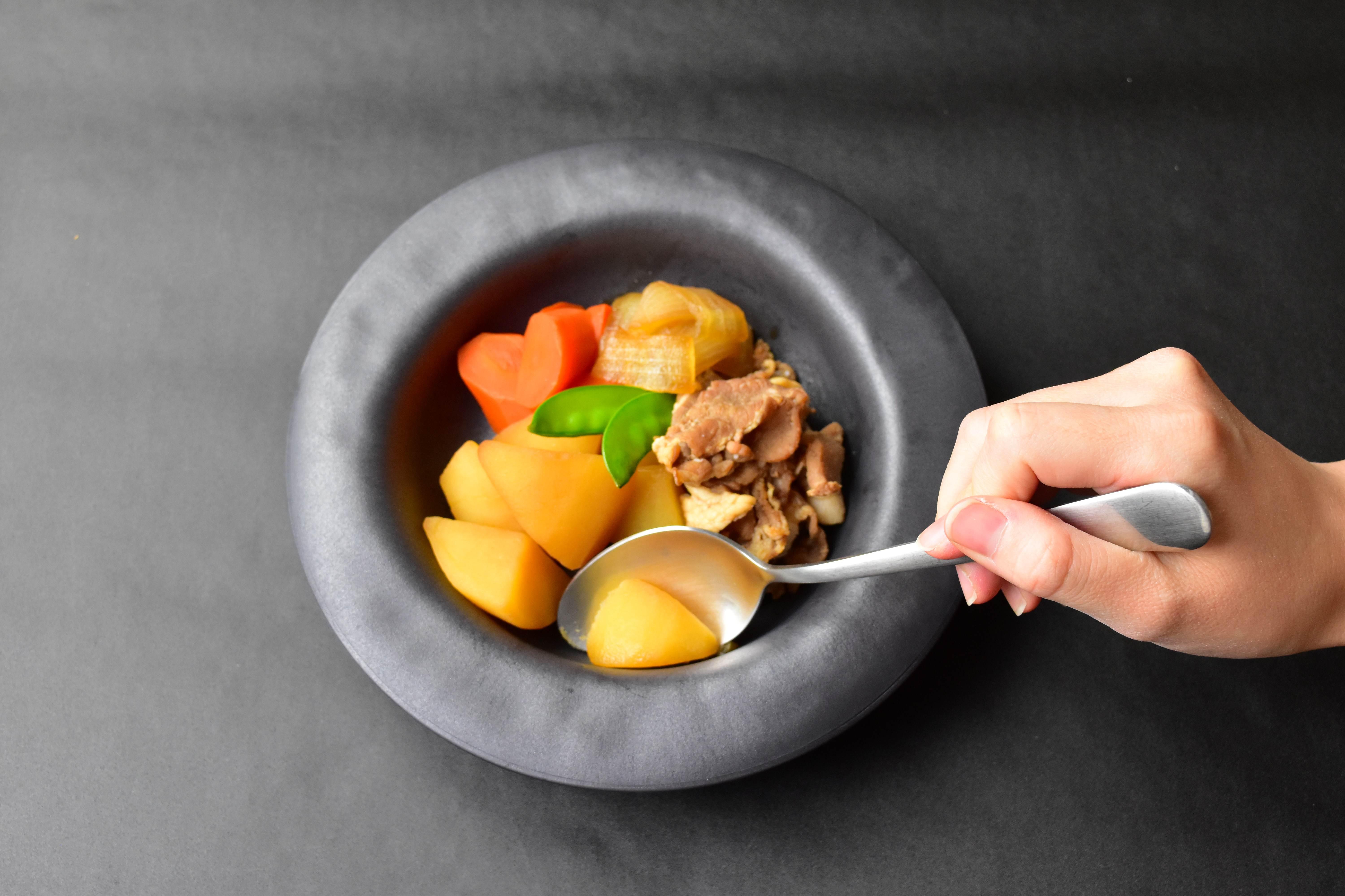 お皿の色は「墨色」という色を選択しています。高齢者になるとモノを認識する力が弱くなってしまいますが、料理をしっかりと視認できる色調にすることで、より食事がしやすくなるお皿を作りました。
